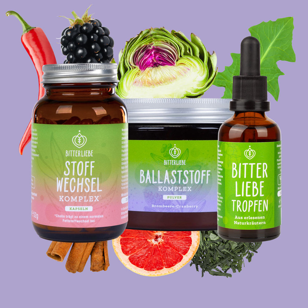 Das Abnehm-Paket nutzt eine gezielte Kombination aus einem Stoffwechsel* Komplex mit Cholin und Zink, Bittertropfen gegen Süßhunger und einem Ballaststoff Komplex Pulver, um den Fettstoffwechsel zu unterstützen, den Süßhunger zu kontrollieren und einen gesunden Darm* zu fördern. Diese synergistische Wirkung ermöglicht effektives Gewichtsmanagement, indem sie den Stoffwechsel* anregt, unerwünschte Heißhungerattacken minimiert und ein langsameres Hungergefühl fördert.