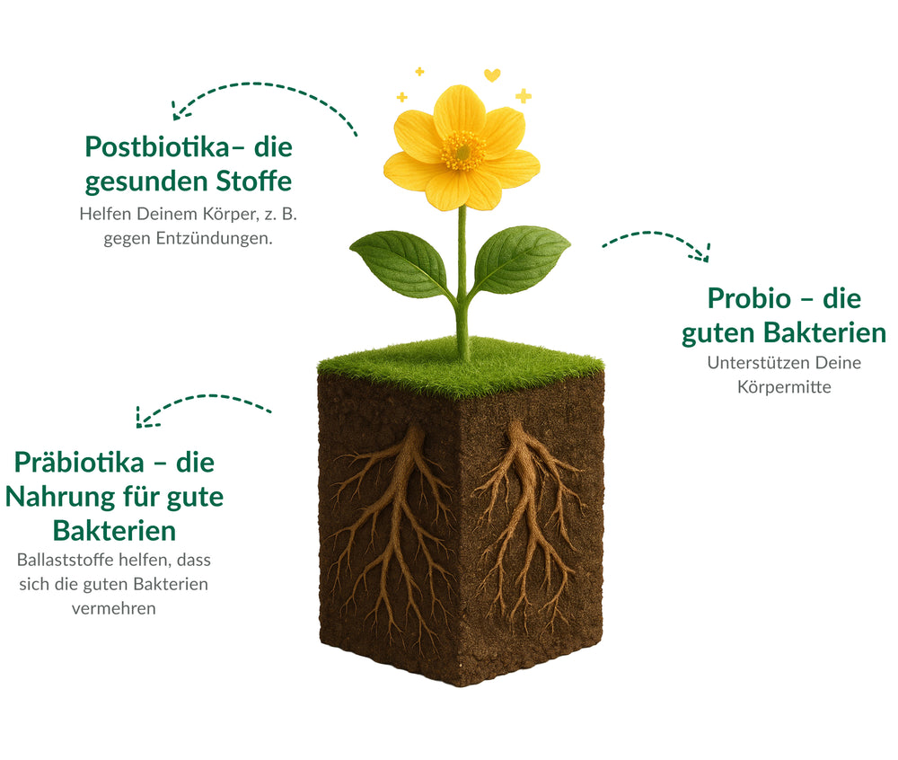 Gemeinsam entfalten Probio-Kulturen, Prä- und Postbiotika ihre volle Wirkung – für eine harmonische Darmflora, verbesserte Nährstoffaufnahme und ein starkes Immunsystem⁵,⁶,⁷.