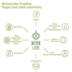 Unsere BitterLiebe-Tropfen enthalten nur die wertvollsten Bitterstoffe aus 15 erlesenen Naturkräutern. Alle BitterLiebe Produkte sind garantiert tierversuchsfrei und für Veganer geeignet.