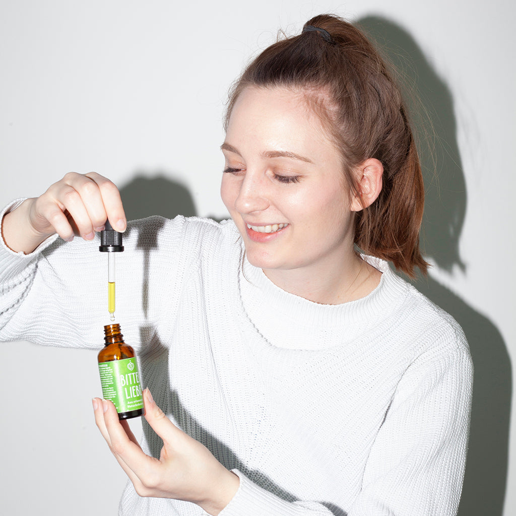 Durch den praktischen Pipettenverschluss sind die BitterLiebe Tropfen auch für Unterwegs und die Handtasche 👜 geeignet.
