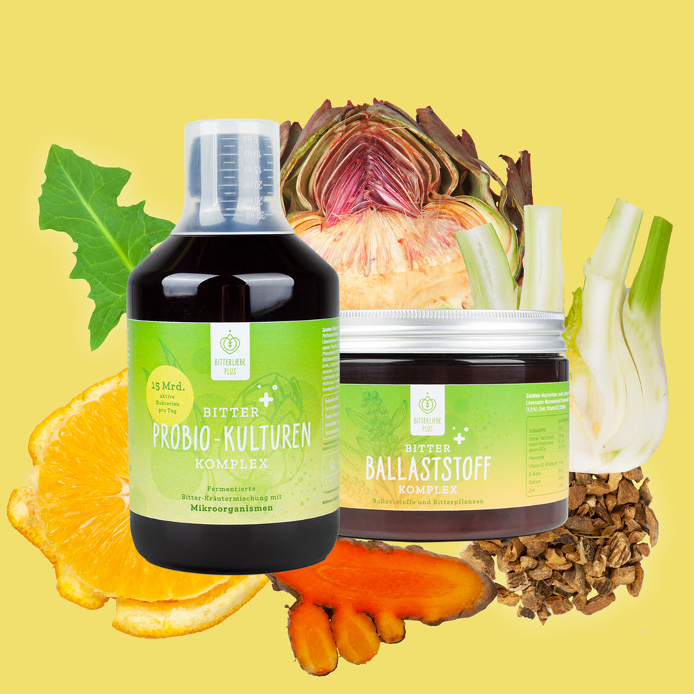 Mit unseren Bitter Darmkur Paket erhältst du unseren Ballaststoff Komplex und unseren Probio-Kulturen Komplex in einem praktischen Vorteilsset.