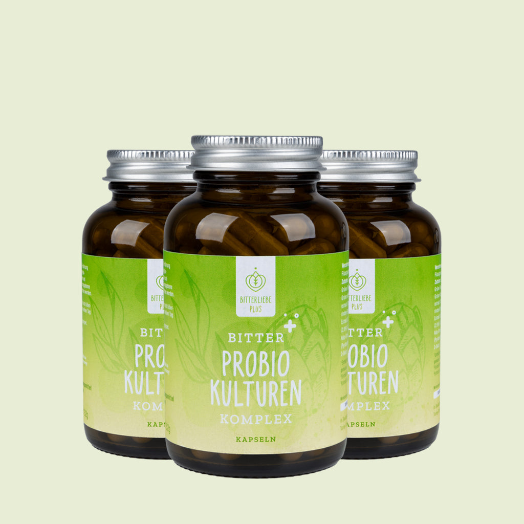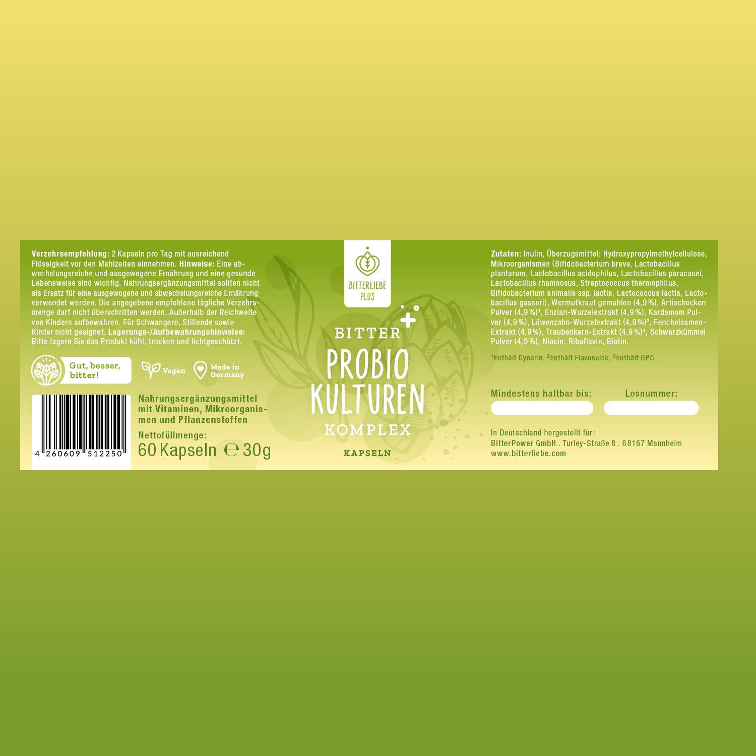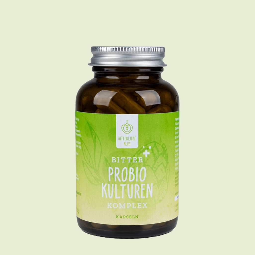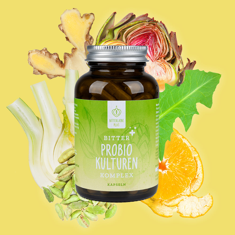 Inulin, Überzugsmittel: Hydroxypropylmethylcellulose, Mikroorganismen (Bifidobacterium breve, Lactobacillus plantarum, Lactobacillus acidophilus, Lactobacillus paracasei, Lactobacillus rhamnosus, Streptococcus thermophilus, Bifidobacterium animalis ssp. lactis, Lactococcus lactis, Lactobacillus gasseri), Wermutkraut gemahlen (4,9 %), Artischocken Pulver (4,9 %) 1, Enzian-Wurzel-