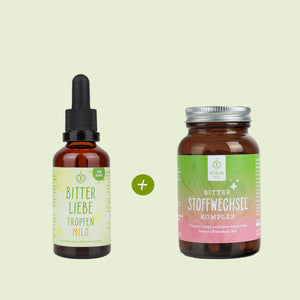 Mit dem BitterLiebe Fitness-Paket mild erhältst Du unsere BitterLiebe Tropfen mild und Stoffwechsel* Kapseln in einem praktischen Set zum Vorteilspreis. Die beiden Produkte ergänzen sich perfekt und können gemeinsam verwendet werden.