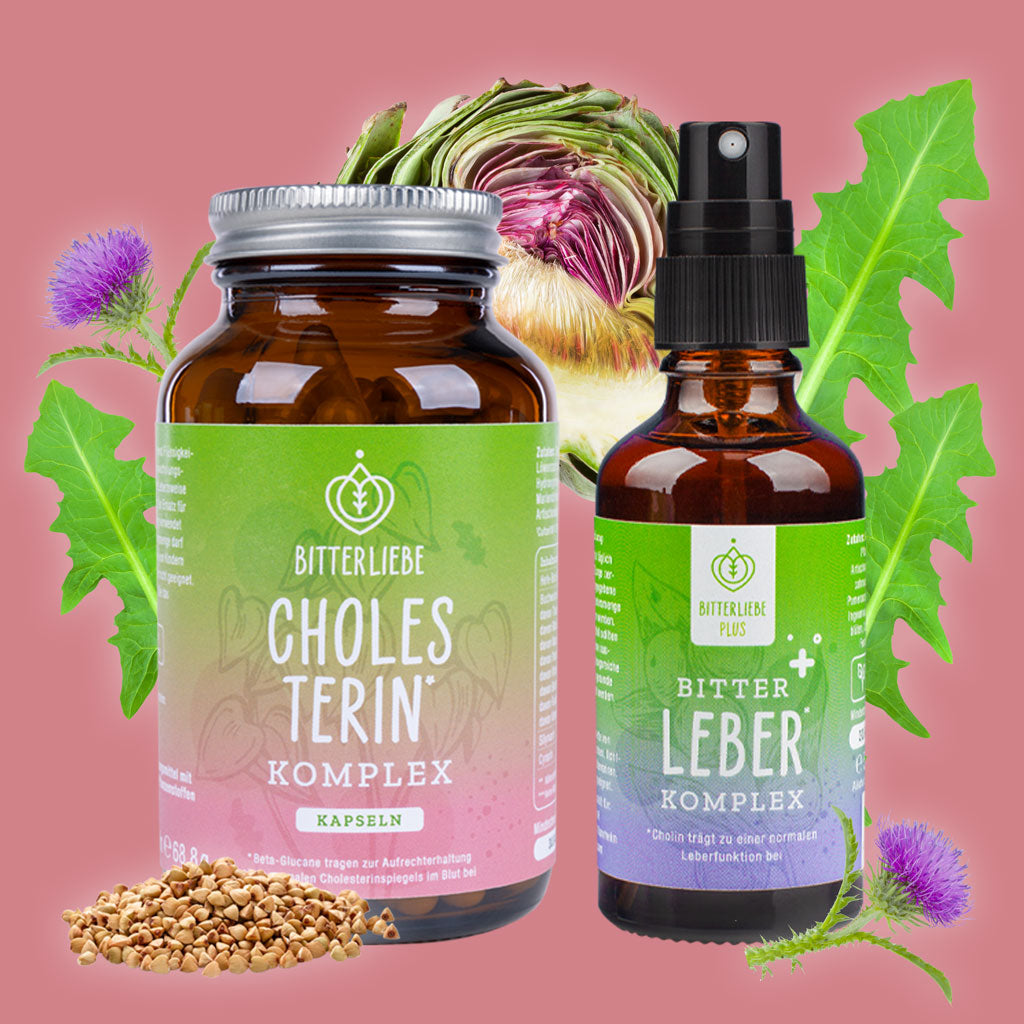 Das BitterLiebe Power Detox Paket bietet einen ganzheitlichen Ansatz, um die Gesundheit Deines Körpers auf mehreren Ebenen zu fördern. Der BitterLiebe Cholesterin* Komplex wurde speziell entwickelt, um einen gesunden Cholesterinspiegel zu unterstützen, während der BitterLiebe Leber* Komplex darauf abzielt, die natürlichen Entgiftungsprozesse der Leber optimal zu begleiten. Da die Leber eine Schlüsselrolle bei der Regulierung des Cholesterins spielt, ergänzen sich diese beiden Produkte ideal. Gemeinsam sorgen sie dafür, dass Dein Körper die nötige Unterstützung erhält, um Stoffwechselprozesse im Gleichgewicht zu halten und langfristig gesund zu bleiben.