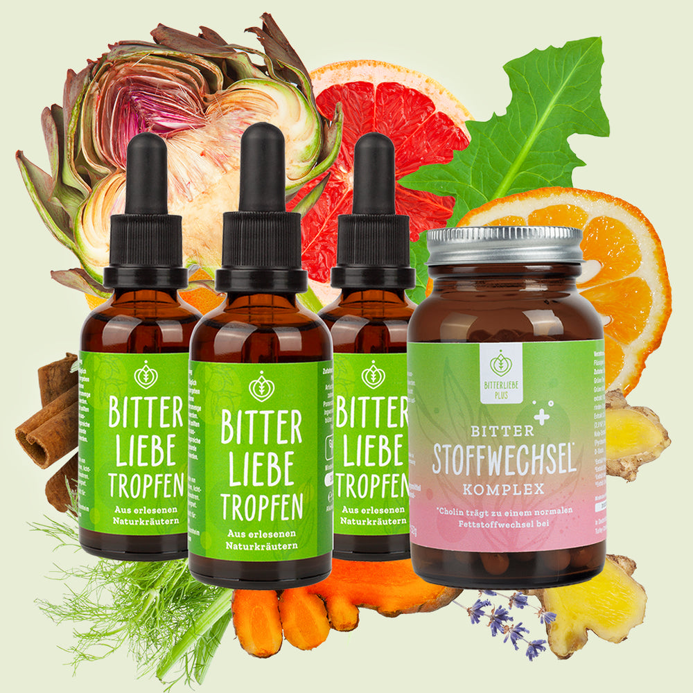 Mit dem BitterLiebe Synergie-Paket erhältst Du unsere BitterLiebe Tropfen und Stoffwechsel* Kapseln in einem praktischen Set. Die beiden Produkte ergänzen sich perfekt und können gemeinsam verwendet werden.