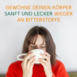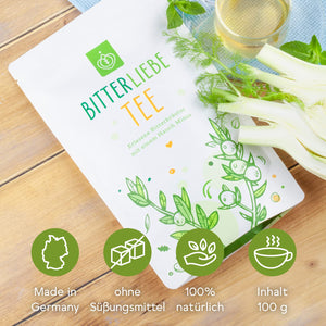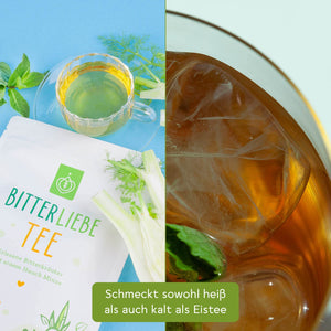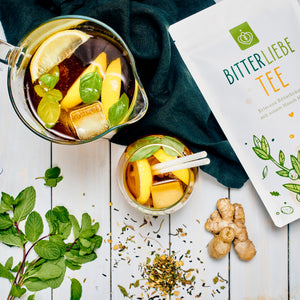 Mit Hilfe unseres BitterLiebe Tee's kannst Du Dich ganz einfach und lecker wieder an Bitterstoffe gewöhnen. Dieser enthält ausgewählte, erlesene Bitterkräuter mit einem Hauch Minze 🌱 und ist sowohl heiß als auch kalt genießbar.