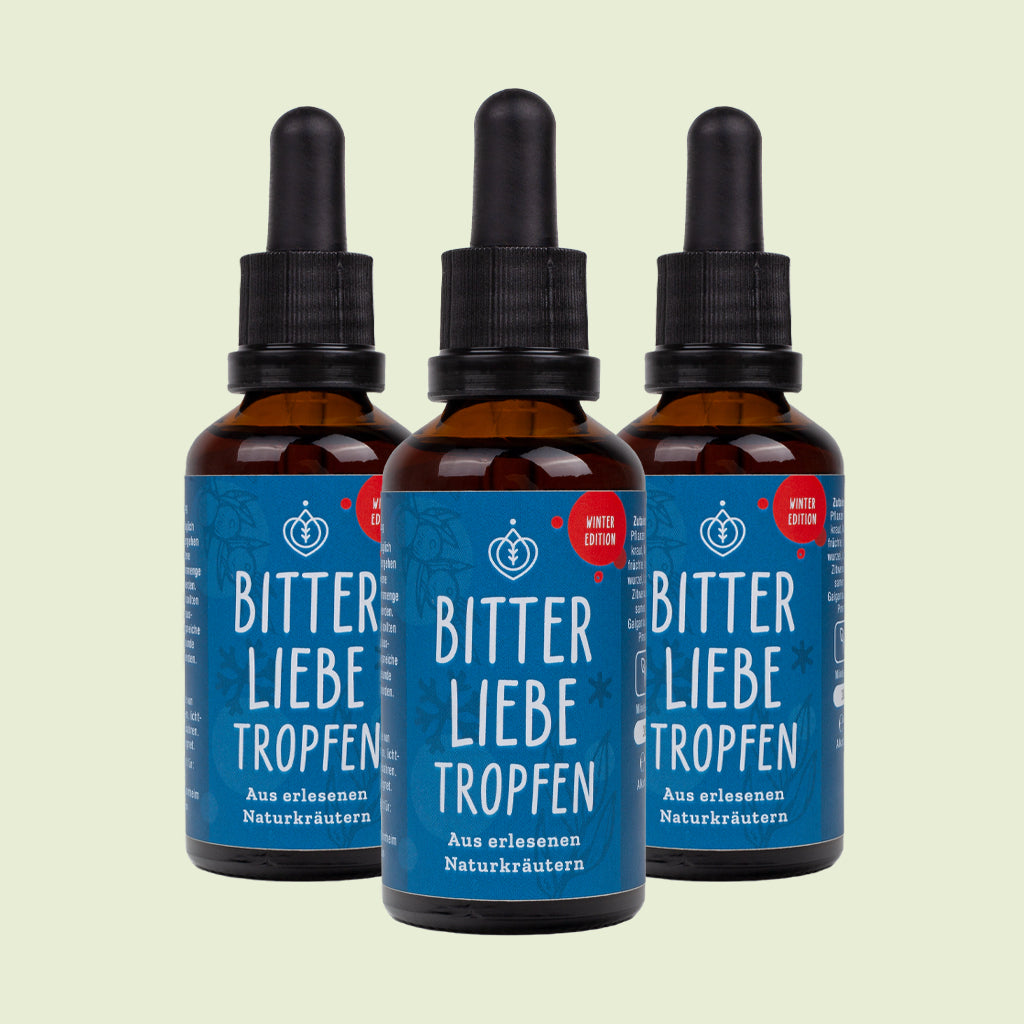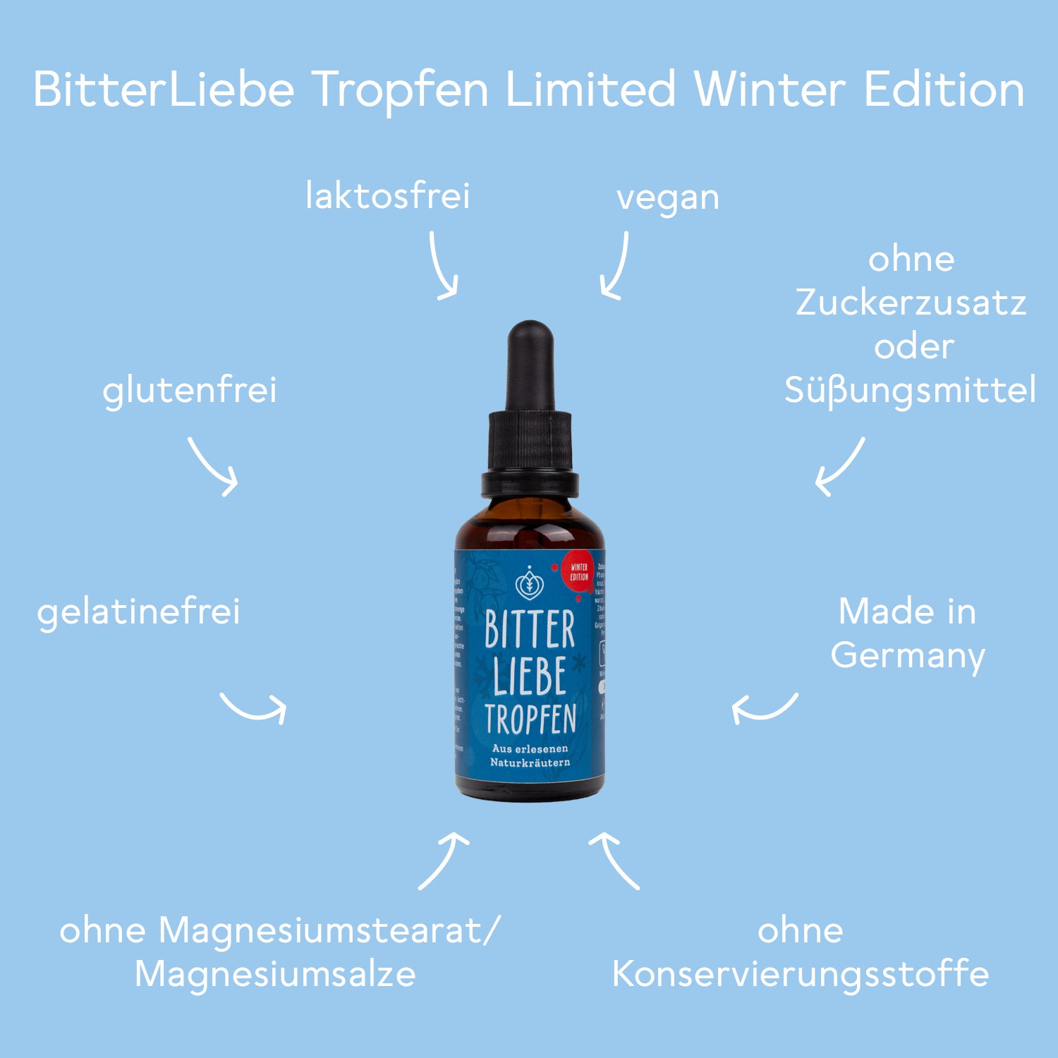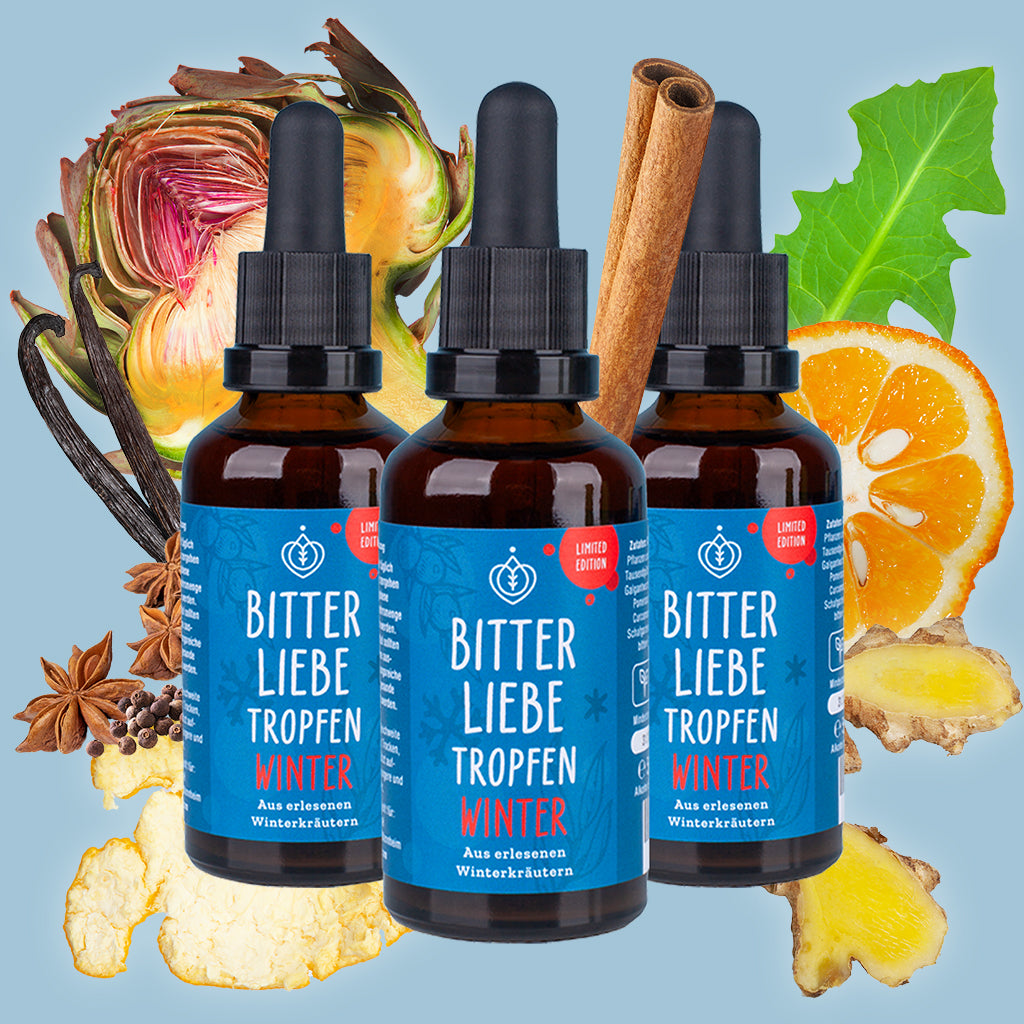 Unsere BitterLiebe-Tropfen Winter Edition enthalten nur die wertvollsten Bitterstoffe aus 20 erlesenen Naturkräutern. Alle BitterLiebe Produkte sind garantiert vegan.