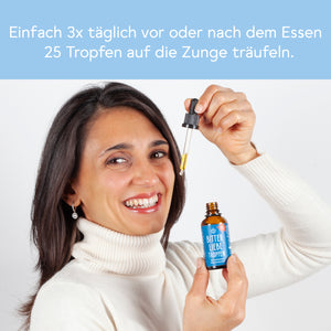 Wir empfehlen, dreimal täglich jeweils 25 Tropfen (entspricht ca. einer halben Pipette) auf der Zunge zergehen zu lassen. Die angegebene empfohlene tägliche Verzehrsmenge darf nicht überschritten werden. Genau so wie Du dich an süss, sauer, salzig, scharf und umami gewöhnen konntest, kannst Du dich auch an bitter gewöhnen.
