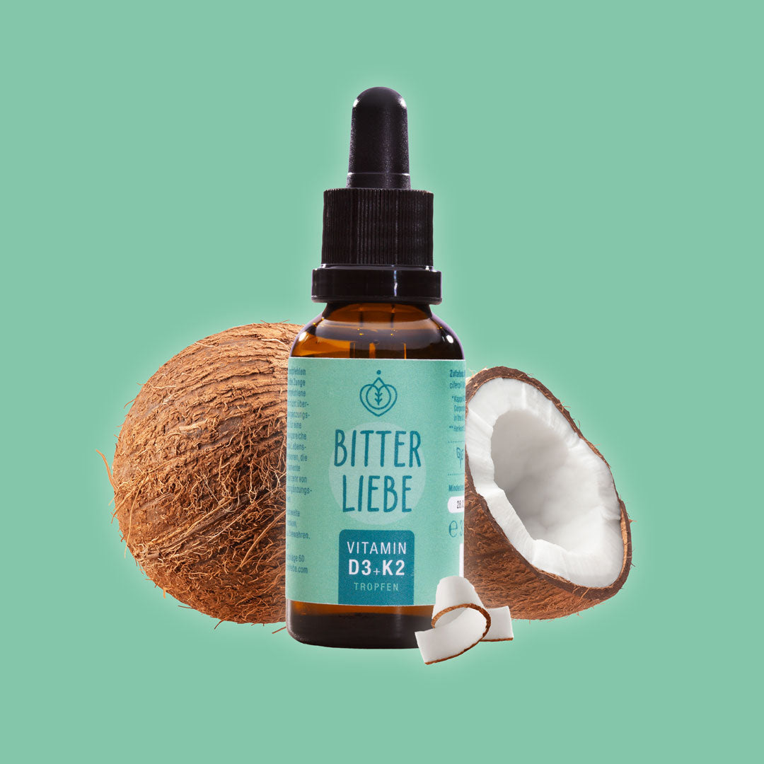 Unsere Tropfen sind eine hochwertige Kombination aus veganem Vitamin D3 und bioaktivem Vitamin K2. Sie unterstützen Deinen Körper dabei, Calcium optimal zu verwerten – für starke Knochen, ein starkes Immunsystem und mehr Balance im Alltag.