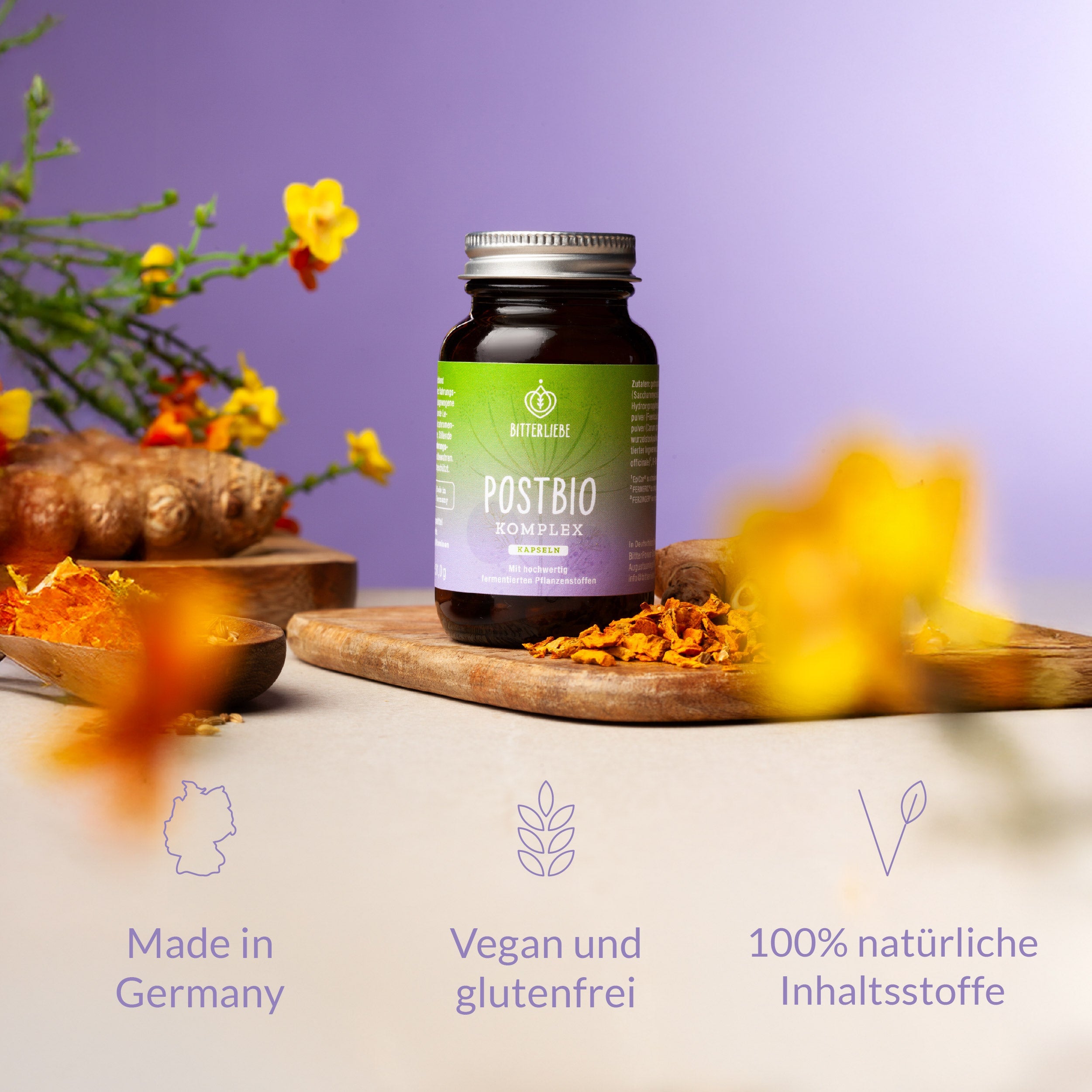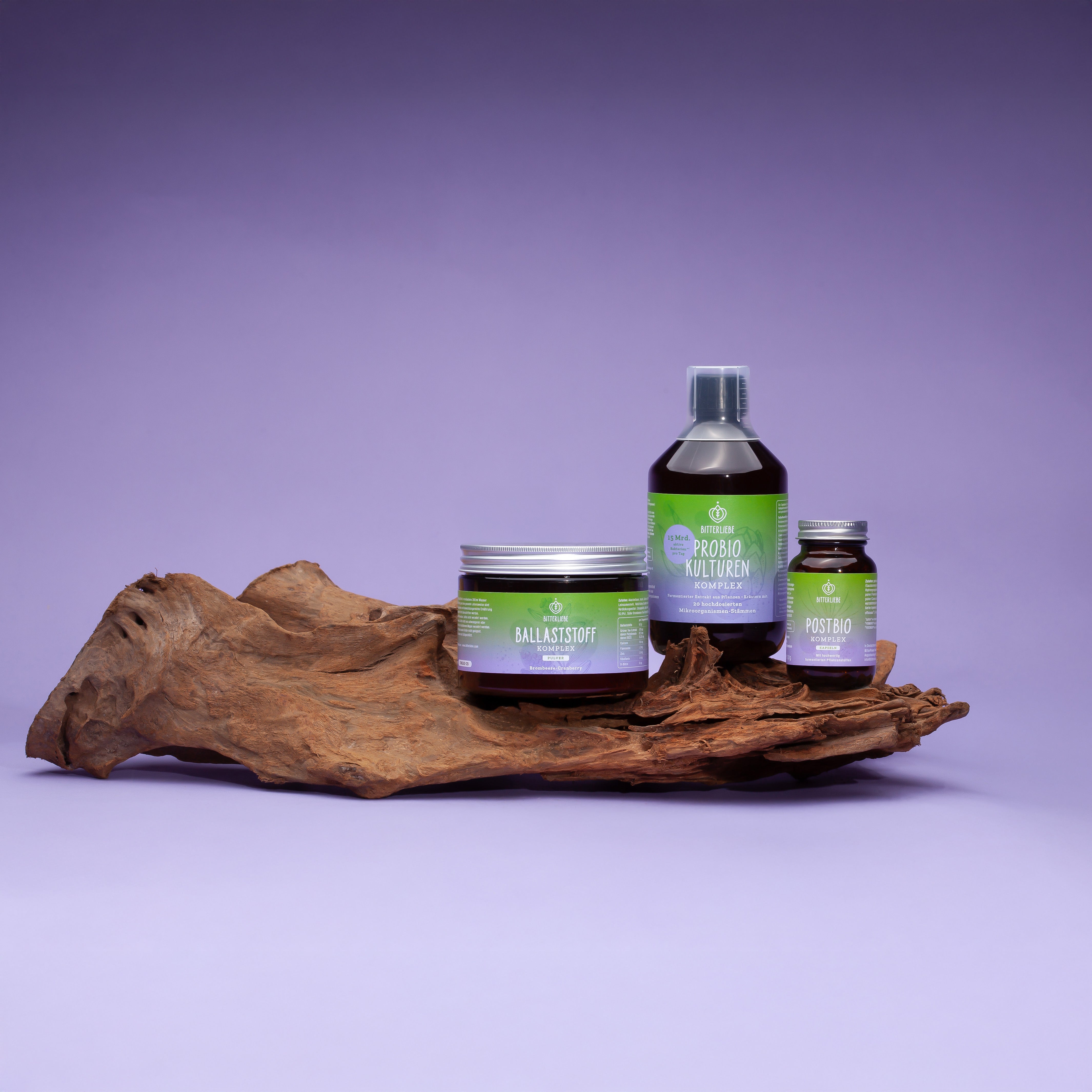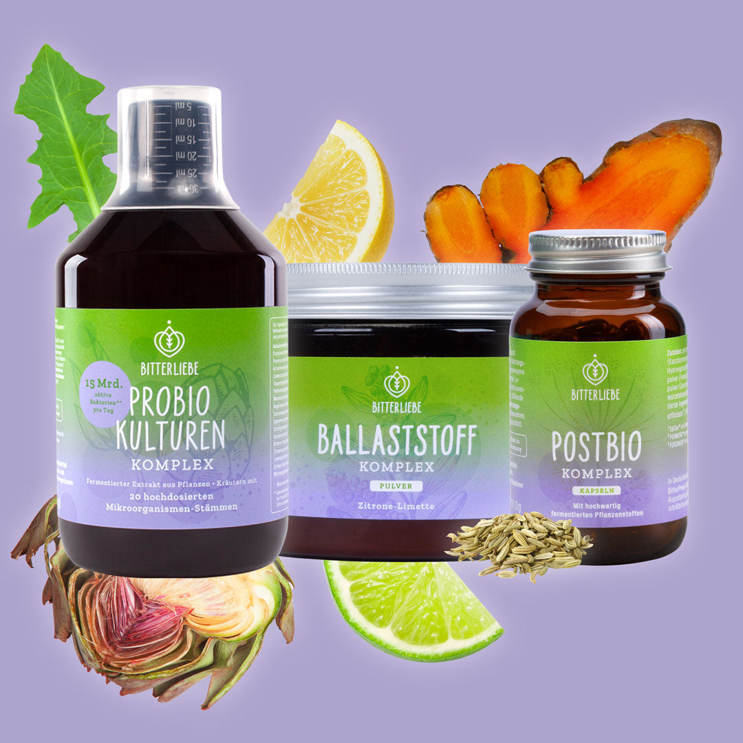 Der Probio Kulturen Komplex enthält eine Vielzahl von Bakterienkulturen, die dabei helfen können, das Gleichgewicht der Mikroorganismen wiederherzustellen. Die Mikroorganismen können so in großer Zahl den Darm erreichen und ergänzen die Wirkung der Ballaststoffe ideal. Ergänzt wird das Bundle durch den BitterLiebe Postbio Komplex: eine innovative Kombination aus fermentierten Pflanzenextrakten, hochwertigen Bitterstoffen und drei lizenzierten Postbiotika-Rohstoffen [1,2,3]. Diese liefern die wertvollen Stoffwechselprodukte, die nützliche Darmbakterien bereits gebildet haben – und machen die Formel so besonders effektiv.