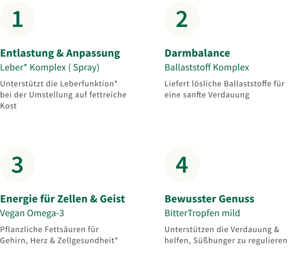 „Die Keto-Umstellung stellt den Körper vor besondere Anforderungen: Leber, Fettstoffwechsel und Verdauung arbeiten intensiv, während Süßhunger den Einstieg erschweren kann. Das Keto Paket kombiniert gezielt Bitterstoffe, Ballaststoffe, Cholin und Omega-3, um den Körper während der Keto-Phase sanft zu unterstützen.“